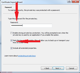 - Type the randomly generated password created in Step 5 and check the “Mark this file as Exportable” checkbox to export this certificate for backup. Click Next.